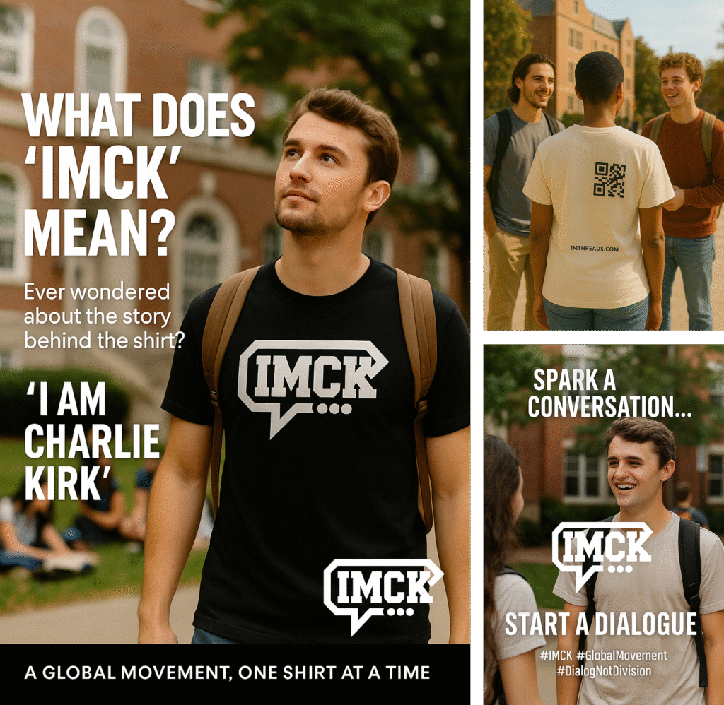 The IMCK speech-bubble logo naturally invites curiosity, opening the door to meaningful dialogue about faith, freedom, and values. Each shirt becomes a chance to share your belief.